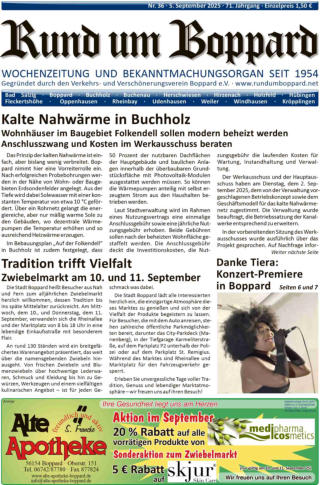 “Rund um Boppard” gibt es seit dem Jahr 1954. Die Redaktion ist unabhängig und unterliegt keinen kommunalen Weisungen. Wir schauen kritisch hinter die Kulissen, schauen dem Stadt-rat bei seinen Beratungen zu und berichten darüber, gebenRaum für Leserbriefe und die Meinungen unserer Leser. Wirsind überparteilich und neutral. Bei uns lesen Sie Informa-tionen, die Sie woanders in dieser Qualität und Aktualitätoftmals nicht finden können.“Rund um Boppard” beschränkt sich in seiner Bericht-erstattung bewusst auf Boppard und seine Ortsbezirke, diesaber dafür so umfassend wie möglich. “Rund um Boppard”wird hier in Boppard von Boppardern gemacht. Wir von “Rund um Boppard” sind ein traditionellerFamilienbetrieb in der Bopparder Fußgängerzone.“Rund um Boppard” kann beim Zeitschriftenhandel erworbenoder als Abonnement wöchentlich direkt zu Ihnen nach Hausegeliefert werden.