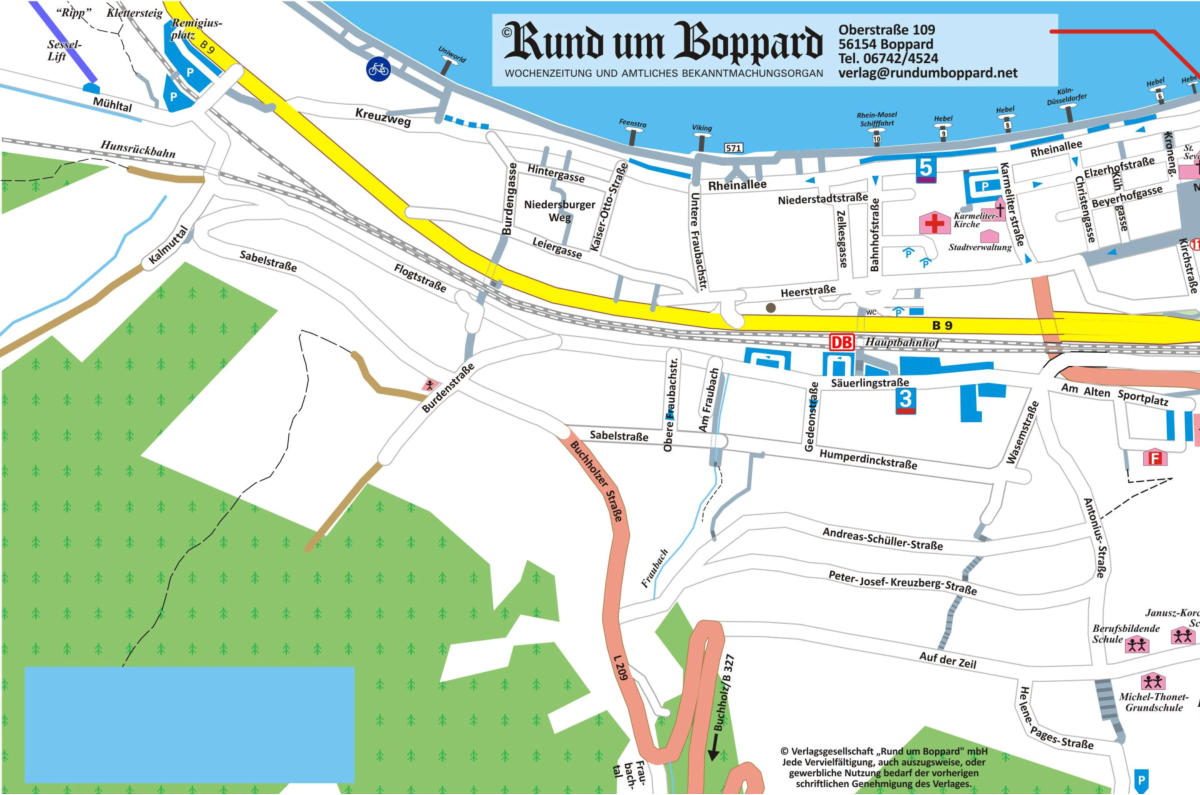 Dies ist der von “Rund um Boppard” herausgegebene Stadtplan von Boppard. Er ist derzeit in der dritten Auflagekostenlos erhältlich in unseren Verlagsräumen und in verschiedenen Geschäften und Hotels der Stadt.